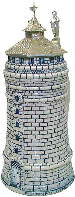 This 1.0 L stein represents one of the Nuremberg towers, namely the Frauentorturm, rebuilt to its present form in 1558, to guard the Frauentor (gate). This tower is unique due to its arched windows and round, top window. In 1849 the city wall was opened up close by, and a new gate, the Königstor was built for traffic access to the railway station. Due to essential road widening, the Königstor was demolished in 1892. Because of its proximity to the Königstor, the Frauentorturm was, and still is, often wrongly referred to, as the Königstorturm. Today, the Frauentor has pedestrian access only. This stein is usually attributed to Merkelbach & Wick.