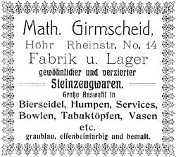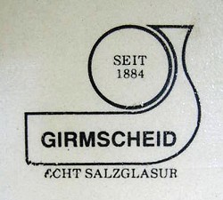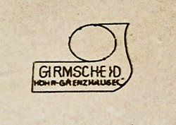 A merchandising company was started in 1870, pipe manufacturing however did not commence until 1884 with stein manufacturing some years later. Between 1920 and 1931, the company was in various partnerships, notably with Simon Peter Gilles & Sohn (wholesaler and pewterer) and Alfons & Eduard Michels (a stoneware wholesaler, glass decorator, pewterer and pipe wholesaler) after which time they continued to operate separately. Karl Girmscheid took over in 1928, until his death in 1949 and was followed by Frau Cornelia Girmscheid until 1954 or 1955. On 21st December 2007 the decision was made to liquidate