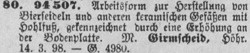 Published in 'Sechste Beilage zum Deutschen Reichs-Anzeiger und Königlich Preußischen Staats-Anzeiger Nr.126", Berlin 31st May 1898, / "Central-Handels-Register für das Deutsche Reich (Nr.126C)", / "Gebrauchsmuster". Re. DRGM 94507: "80. 94507 Arbeitsform zur Herstellung von Bierseideln und anderen keramischen Gefäßen mit Hohlfuß, gekennzeichnet durch eine Erhöhung an der Bodenplatte. M. Girmscheid, Höhr. 14.3.98 - G. 4980." Re. DRGM 94507, issued on 14th March 1898 to M. Girmscheid, Höhr, was a method of creating a raised hollow base on beer steins and other vessels.