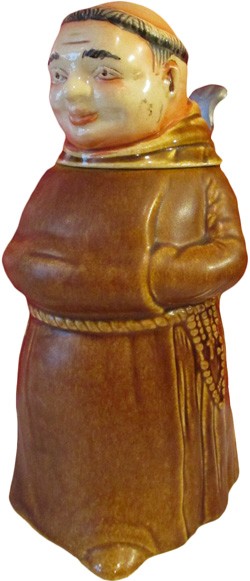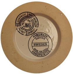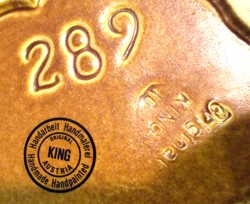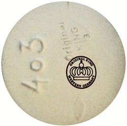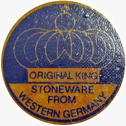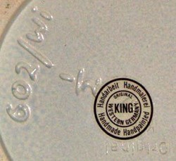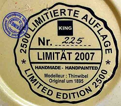 This limited edition porcelain stein was made by Albert Stahl with a mould design, coprighted by King-Werk. The main mark is underglaze, but the blue stick-on label indicates that this particular piece was distributed by King-Werk.