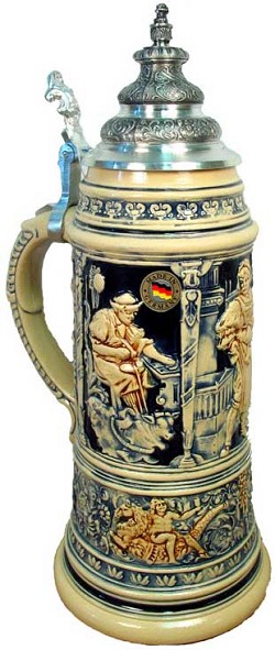 Makers mark shows that the featured stein, made in 2007, is a reproduction of a Marzi & Remy piece, designed in 1895 by Gustav Thinwiebel. The blue ink stamp has "Made in Germany" which was used after 1990.