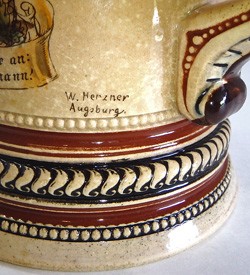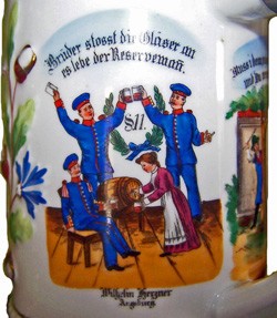 Rear tableau with artist's signature below on Bavarian Army National Service commemoration stein, dated 1899 - 1901.