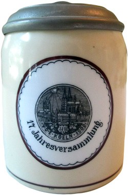 0.3 Litre stein "V.O.E. Cologne 1909" "17th Year of the collection", indicating the 17th anniversary of the the start of production of ceramics at the Keramikerstraße site. The image appears to show an electric light illuminating the city of Cologne.