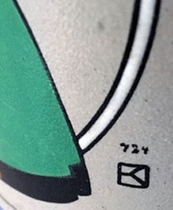 Artist's logo on featured stein, shows either intertwined KD or RD, or perhaps those letters reversed,together with 724 decoration number.