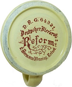 D.R.G specification below: D.R.G 64321 Bier-Trinkgefässe aus mit Emaille oder Schmelzfarben eingebranntem Glas mit durchsichtigen Schauflächen beliebiger Form. Hermann Wenning , Erfurt, Johannesstr. 151. 15.9.96 - W. 4534