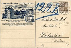 Hermann Wenning, Hohlglas-Grosshandlung, Johannesstraße 151, founded 1871. Postcard sent to Glashüttenwerke Greiner & Co. of Demitz-Thumitz, Saxony, dated Erfurt, 29th July 1947. (. N.B. Close enlargement PRIOR to opening another picture!) ×