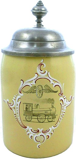 Motif thought to promote swift postal services by rail.Clear glass stein with an enamelled exterior and with two clear vertical slots in the paint acting as beer level indicators.