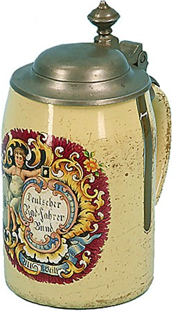 Clear glass stein with an enamelled exterior, with two clear vertical slots in the paint acting as beer level indicators. Transfer decoration "Deutscher Radfahrerbund" (German Cycling Federation), together with Illustration of Child with a Penny Farthing, circa 1896. D.R.G specification below: D.R.G 64321 Bier-Trinkgefässe aus mit Emaille oder Schmelzfarben eingebranntem Glas mit durchsichtigen Schauflächen beliebiger Form. Hermann Wenning , Erfurt, Johannesstr. 151. 15.9.96 - W. 4534