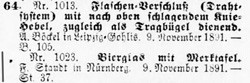 "D.R.G.M. 64. 1023 Bierglas mit Merktafel F. Staudt in Nürnberg 9th November 1891. St.37".