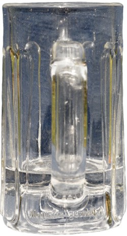 Ribbed press glass beer tankard,available in 5/20ths litre and 7/20ths litre sizes. "Moguntia geschützt", below the handle. Moulded words "D.R.G.M. N.499782" arranged in a circle on the base. Also inside this circle the letter "K" inside a Brewer's Star.