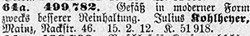 Neunte Beilage zum Deutschen Reichsanzeiger und Königlich Preussischen Staatsanzeiger. Nr. 63. Berlin, Montag, den 11. März 1912.Zentral-Handelsregister für das Deutsche Reich. Gebrauchsmuster.64a. 499 782. Gefäss in moderner Form zwecks besserer Reinhaltung. Julius Kohlheyer, Mainz, Nackstr. 46 15.2.12. K 51 91864a. 499 782. Vessel in modern form in order to be easier cleaned. Julius Kohlheyer, Mainz, Nackstr. 46 15.2.12. K 51 918