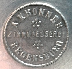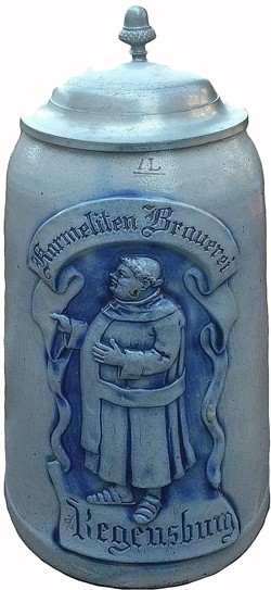 A Regensburg pattern stein showing the normal capacity mark on the front, and a relief image advertising the Carmelite brewery which was founded in Straubing in 1367, but has been owned by the same family since 1879. In 1447 the Regensburg commissioners tasked their city doctor to test the beer regularly in the town and to pay special attention to the ingredients. After the doctor's bad experiences, the commissioners issued a brewing standard in 1453.