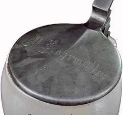 Wholesaler's name cast in the underside of the lid fitted to the featured stein.