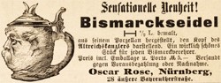 Sensationelle Neuheit! Bismarckseidel I--I 1/2 L. bemalt, aus feinem Porzellan hergestellt, den Kopf des Altreichskanzlers darstellend. Ein wirklich schönes Stück für jeden Bismarckverehrer. Preis incl. Emballage u. Porto M 5.- Versandt gegen Vorausbezahlung oder Nachnahme. Oscar Rose, Nürnberg, 28 äusere Bayreutherstraße. Sensational Novelty Bismarck stein I--I 1/2 Litre. coloured, made from fine porcelain, representing the head of the old Government Chancellor. A really nice piece for every Bismarck admirer. Price including packing and postage 5.00 Marks. Sent after payment in advance or C.O.D. Oscar Rose, 28 äusere Bayreutherstrasße. Nuremberg.