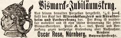 Bismarck = Jubiläumskrug Aus feinem bemalten Porzellan hergestellt, 1/2 L. I-I, stellt den Kopf des Altreichskanzlers mit Kürassierhelm und Lorbeerkranz dar. Krug ist wunderbar modellirt und ist eine schöne Errinerung für jeden Bismarckverehrer. Preis M. 6.- incl. Porto und Verpackung gegen vorherige Einsendung oder Nachnahme. Oscar Rose, Nürnberg, Aeußere Bayreutherstraße. Bismarck = Jubilee Stein Made from finely painted porcelain, 1/2 L. mark, represents the head of the old Government Chancellor with a Cuirassier's helmet and Laurel wreath. The stein is wonderfully sculpted and is a beautiful remembrance for every Bismarck admirer. Price 6.- Marks includes postage and packing after prepayment or C.O.D. Oscar Rose, Aeußere Bayreutherstraße. Nuremberg,