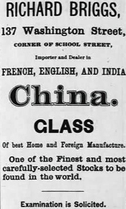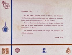 Established 1798. Mr. Richard Briggs, Corner of School and Washington Streets would respectfully solicit your inspection of his collection of rare and curious Porcelain and Glass. Many of the articles displayed are from designs exclusively his own, and the entire stock comprises his personal selections from the manufactories of Europe. All purchases packed without extra charge, and guaranteed safe at their destination. Boston 1878.