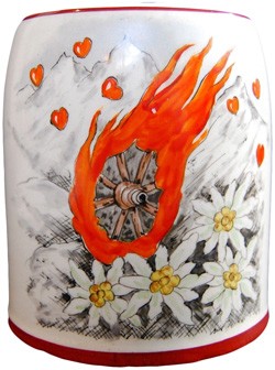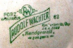 Rudolf Wächter (b.13/12/1868, Rauenstein). He served his apprenticeship between 1881 & 1885 at Porzellanfabrik Gebrüder Schoenau in Hüttensteinach and worked a further eight years as decorator for the factory in Kahla. In 1893 Wächter founded his own decoration business in Hüttensteinach. In 1913 he moved to Kirchenlamitz where in 1914 he formed a short lived partnership with Erhard Fürbringer. During WW1 most men joined the army, including Erhard Fürbringer, so from 1917 Wächter was again a sole trader. On Jan 2, 1919 Franz Schaller (b.6/7/1895, Kirchenlamitz) joined the company. By October 2nd he had married Elly, one of Wächter's daughters. They started their own porcelain production around 1925 which eventually evolved into a company speciality of silver overlay on porcelain. In 1930, Franz Schaller became director, and then joint owner in 1938. Due to good business decisions, the company did quite well during WWII. However Rudolf Wächter died in 1942. The company was now owned by Franz Schaller and the widow Fanny Wächter. Following WWII the company decorated lidded beer steins. The raw 0.5 litre steins were bought from a company in Altenkunstadt and decorated by sixteen to eighteen people from a retraining course. New electric glazing ovens were installed in 1950. By 1955 the Wächter company had 114 normal workers and 16 salaried employees. The late 1950's saw the replacement of silver decorations through matt and high polished gold decorations during the late 50's. After Fanny Wächter's death, from January 1st 1962 Franz Schaller became sole owner. During this period the company also had its largest workforce, between 200 and 220 people. However by 1971, trading conditions had deteriorated to the point that by early 1974, the factory closed.