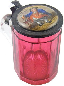 Raspbery coloured glass stein with pewter lid and decorated porcelain insert.