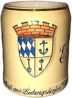 "Greetings from Ludwigshafen a/Rh." c/w a castellated Shield which contains the Bavarian Lozenges and an anchor for Ludwigshafen, plus spade and key symbols signifying outlying villages, now absorbed and all named for King Ludwig 1 of Bavaria. Rhineland Palatinate was a region of Bavaria until after WWII.