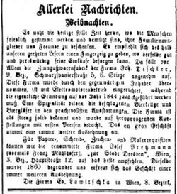Vienna Newspaper Advertisement Christmas 1898The pewter factory of Joh. Tischler, 9th district, Schwarzspanierstraße 5, 6th staircase, is particularly striking. This company was taken over by the current owner and is equipped with an electric motor, while the actual foundation can be traced back to 1844. A speciality is the lidding of beer mugs and beer glasses in the most magnificent equipment. The company is extremely solid and was awarded first prizes at excellent exhibitions. The wholesale business continues to expand.