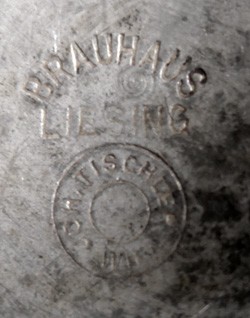 Cast marks on the underside of the lid, on right, on the featured stein. BRAUHAUS LIESING JOH. TISCHLER. WIEN