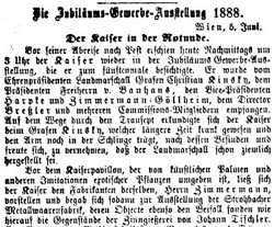 5th June 1888: In front of the Kaiser Pavilion, which is surrounded by artificial palm trees and imitations of erotic plants, The Emperor introduced himself to the manufacturers of those products, and then went to the exhibition of thatched roofs, a metal goods factory, whose objects received applause as also were the items displayed by Pewterer Johann Tischler.