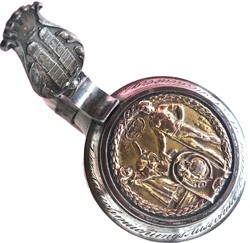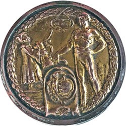 Pewter lid assembly with a brass insert, on which the following text is cast, "All Heil" & "Deutscher Rad- Fahrer Bund"The lid insert was designed by Professor Franz Widnmann, (b.1846-d.1910) who taught at the Kunstgewerbeschule, Munich, around this time. Details can be seen in the R. Merkelbach special price list of 1905, pages 18-19.