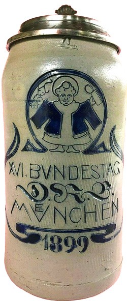 Beer stein dedicated to the 16th National Day of the German Cycling Federation in Munich, 1899. The stein graphic was designed by Georg Ritzer, on a 1 litre Mass by Reinhold Merkelbach. Ritzer concentrated on the Munich Kindl essentially reducing it to its outlines. He is therefore at the beginning of a series of artists who, at the beginning of the 20th century, were leaving behind the previous generation and began to treat the Munich Kindl in graphically clear, fresh designs.
