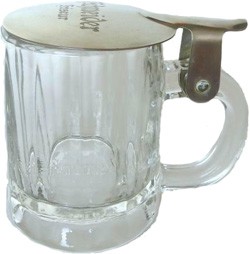 Glass stein with two spigots projecting from the sides at the top of the handle.