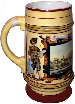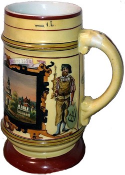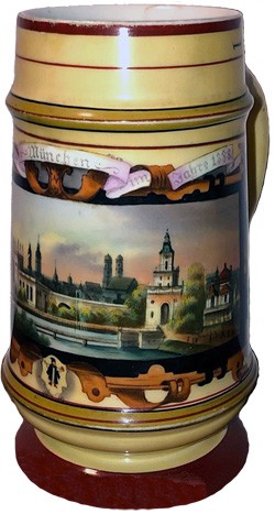 1 litre Porcelain souvenir stein dated 1888. It has a lithophane showing King Ludwig II of Bavaria, who had died in 1886. However, Otto, his younger brother, who was to be king, had already been declared mad, and regents ruled in his place. They presumably weren't considered to be sufficiently royal to be on a lithophane. ×