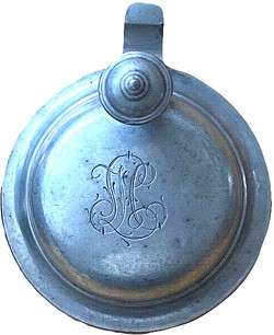 Top side of flat pewter lid, with original owner's initials inscribed.
