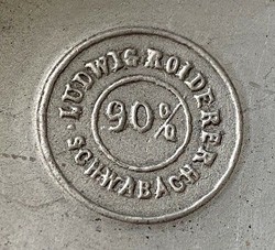 Pewterer's cast mark on the underside of the flat lid, Showing the metallurgy 90% tin, with presumably 10% lead.