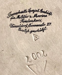 "Thanscheidt's Spezial Geschäft für Militär und Marine Andenken,Dusseldorf, Tannenstraße 27. Gesetzlich Geschützt."