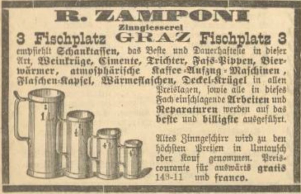 In April 1878 he took over the tin foundry from Anton Enzel at Fischplatz No. 3 (today Andreas-Hofer-Platz) in Graz. In March 1892, he and his wife acquired a property at Strauchergasse 22 in order to operate a siphon and soda water factory there in addition to their tin foundry after conversion. But after violent protests from the residents (mainly for health reasons due to the operation of the melting furnace), the city of Graz only granted him permission for a siphon and soda water factory. The pewter foundry remained at Fischplatz No.3. In 1910 he handed over the business to his son Rudolf, who only continued to run it for a few years.