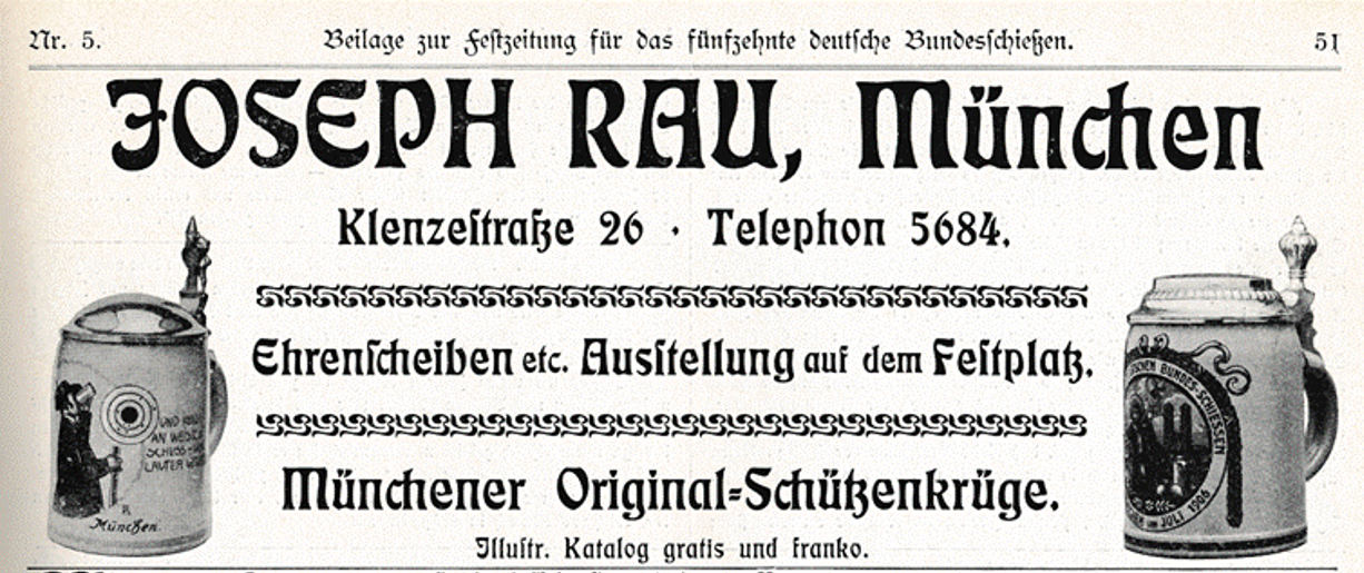 The company Joseph Rau is known to have been active around 1906 as a vendor of steins. An advertisement in 1906 mentions the sale of "Original Schützenkrüge" (steins that commemorate shooting events).