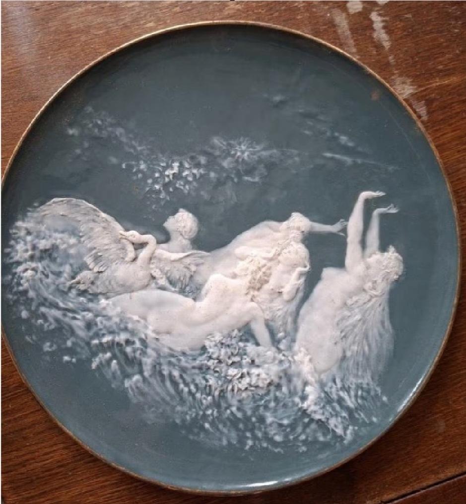 The mark has been seen on a wall plaque in the pâte-sur-pâte technique, as well as on two ceramic vases.