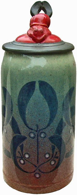 This stein was moulded in Saarguemines by the Porzellanfabrik Utzschneider & Cie and supplied to the Lechtaler Keramik von Heider (& Söhne) for finishing. The speckled graduated tint glaze requires skilful handling and is not done on a mass production basis. The thumbpull is known to be unique to the von Heider's.