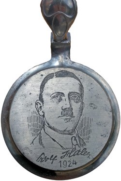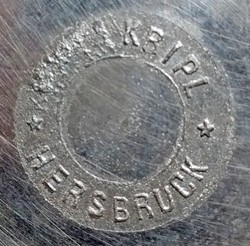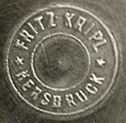 Pewter lid by Fritz Kripl. It is unknown whether the acid etched image and text shown here, featured on the lid originally, or were added more recently. The lid is mounted on a replacement glass stein.