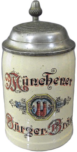 Merkelbach & Wick brewery 1/2 ltr.stein, "Münchener Bürger Bräu, dated prior to 1920. The contract to supply these steins was inherited after the takeover of the W. Wild company.