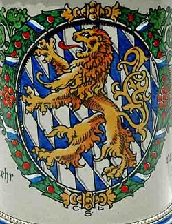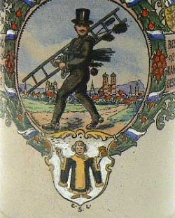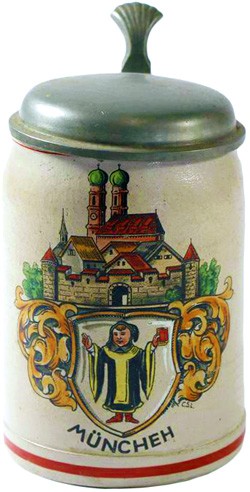 0.5 litre Marzi & Remy souvenir stein, showing the Munich Child, the Frauenkirche and the city walls. Note the mis-spelling of München. The decorator's initials are bottom right of the cartouche.