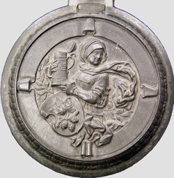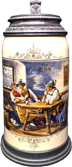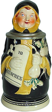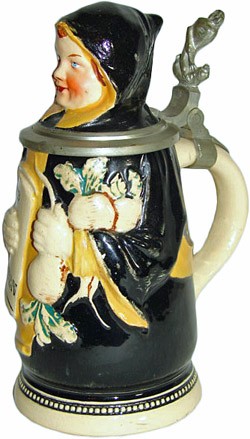 Side view of 1/2 Litre stein depicting Münchner Kindl or Munich Child. Pottery by Merkelbach & Wick, pewter by L. Lichtinger. This stein is also seen with J.Reinmann impressed on the base.