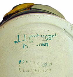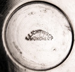 Base inkstamp on 1/2 Litre stein depicting Münchner Kindl or Munich Child. Pottery by Merkelbach & Wick, pewter by L. Lichtinger.