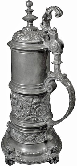 Earlier fabricated pewter stein made from castings, soldered together with beaten sheet pewter components.