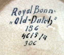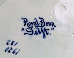 Handwritten ink mark, "Royal Bonn, Delft", dated 1890 - 1920, plus impressed roundel mark.