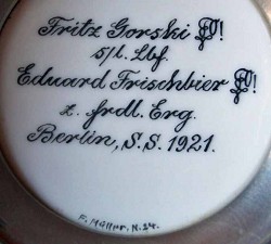 Artist's signature on student stein, dated 1921. He also lists his, then current, postcode, which in conjunction with the address list above, allows approximate dating, even if a year number is missing.