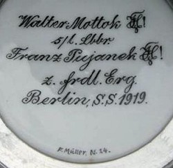 Artist's signature on student stein, dated 1919. He also lists his, then current, postcode, which in conjunction with the address list above, allows approximate dating, even if a year number is missing.