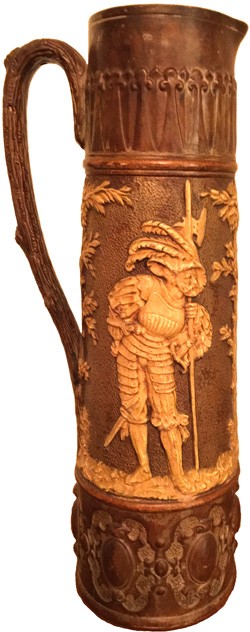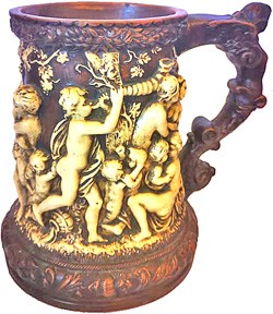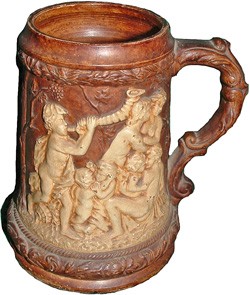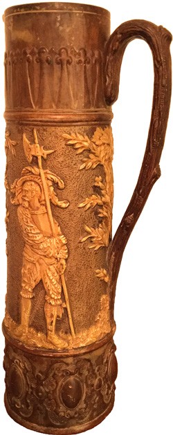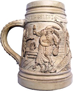 Left hand view of master stein #9749. This stein has two Landsknechte, one on each of the opposingsides, as opposed to the front (opposite the handle) on normal EuropeanGermanic steins. It also has provision (a hole) at the top of the handle to fit a pewter lid.