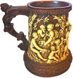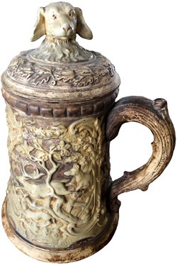Right hand view of master stein #9749. Whilst this stein has provision (a hole) at the top of the handle to fit a lid, it is unknown as to whether Maresch had access to a pewter foundry or just left it as an aftermarket option.