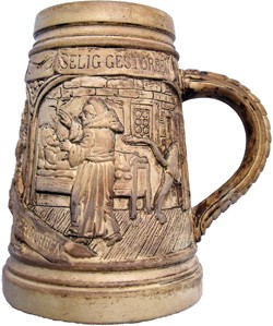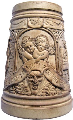 0.5 litre stein #9736, front view"Lustig gelebt und seelig gestorben hat dem Teufel die Rechnung verdorben" A fun life and a blessed death, spoils the devil's bill.