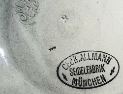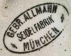 The company was founded on 1 May 1870 by Johannes Allmann and his brother Friedrich Allmann. They enjoyed considerable prosperity up until W.W.1 when they employed 15 pewter foundry men and 15 porcelain painters. Their fortunes between the wars were not as good, needing only three employees during 1934. Their last listing was in the 1941 Adressbuch. On the night of the 4th October 1944, the company effectively ceased trading, due to an Allied bombing raid on Munich, during which the company buildings were completely destroyed. A reconstruction was not attempted after the war.